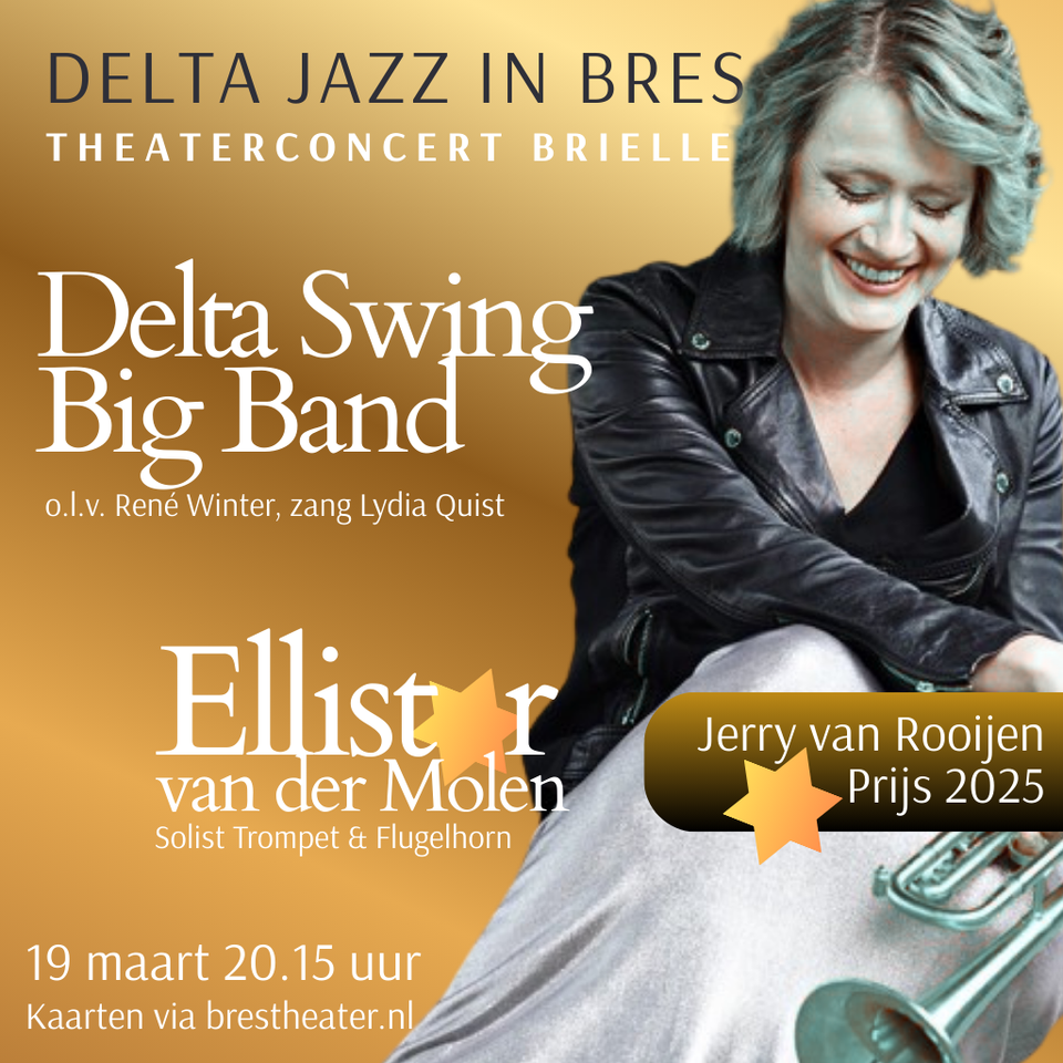 Het is weer sfeervol genieten in het Brestheater. De Delta Swing Bigband (Voorne aan Zee) speelt samen met soliste Ellister van der Molen met trompet en flugelhorn een swingend en indrukwekkend muzikaal programma, met zang van Lydia Quist.