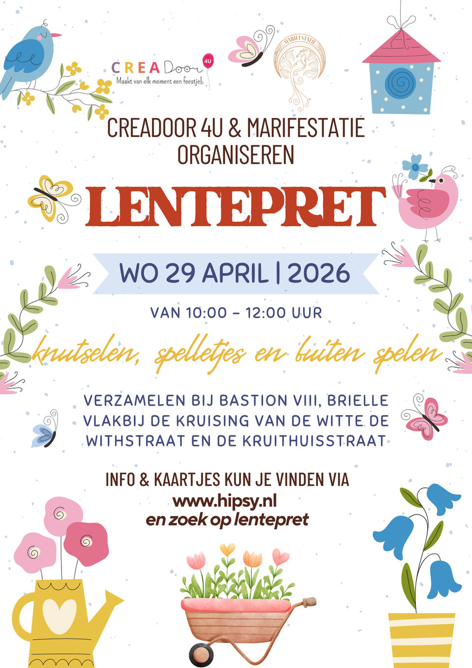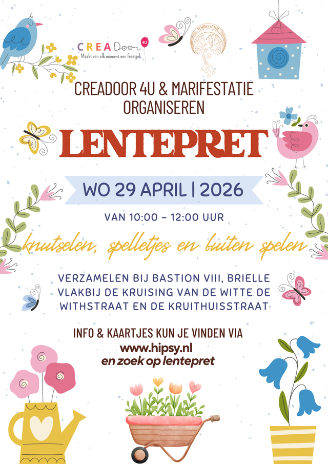 Hoera, het is Lente! Beleef in de meivakantie dit mooie seizoen. Je gaat een lenteknutsel maken en spelletjes doen, gezellig samenzijn met andere kinderen. Uiteraard met iets lekkers.
