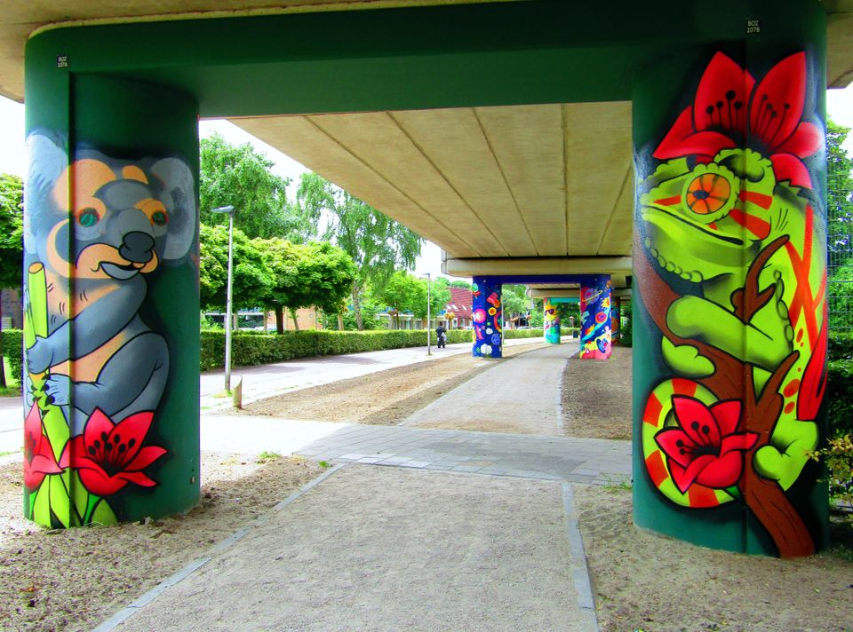 Deze kunst is ontworpen door de kinderen van de basisscholen uit de wijk de Akkers. Het thema "reizen" was een grote inspiratie voor de kinderen. Je ziet kunstwerken over fantasiewerelden en hun favoriete vervoermiddelen tot ruimte reizen, droomvakanties en zelfs bezoekjes aan hun favoriete dier of persoon. Studio Maky heeft deze acht palen in acht weken met hun team kunnen beschilderen.