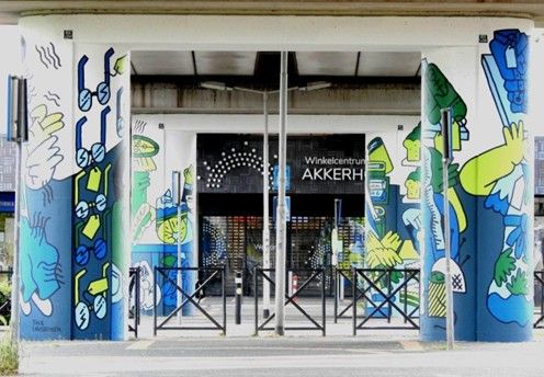 Je vind deze palen naast winkelcentrum Akkerhof. Op deze palen zie je afbeeldingen van artikelen die je in het winkelcentrum kunt kopen.